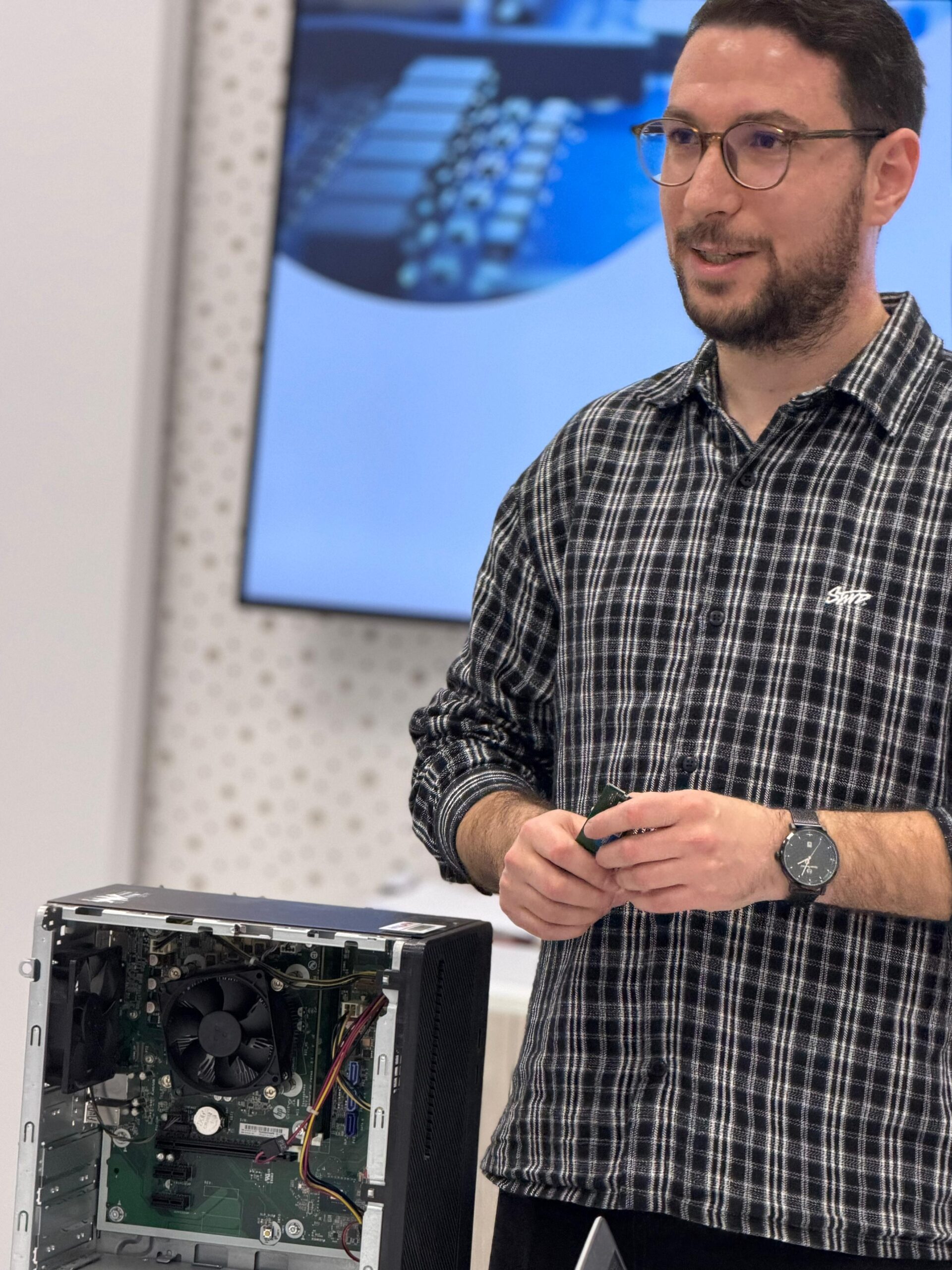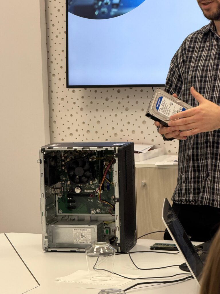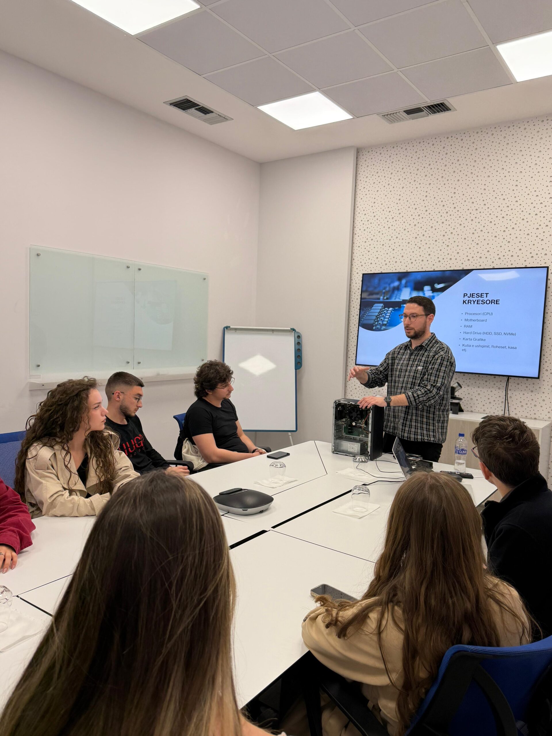 Gjatë sesionit, studentët u njohën me pjesët kryesore që përbëjnë një kompjuter ose server, si procesori (CPU), motherboard, RAM, hard drive (HDD, SSD, NVMe) dhe karta grafike, duke kuptuar funksionimin e secilit dhe rëndësinë e tyre në një sistem IT.